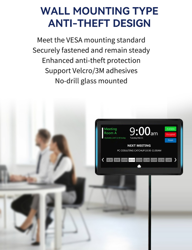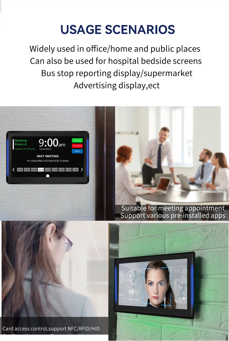 이 태블릿은 회의실 예약에 이상적일 뿐만 아니라 기업 건물, 호텔, 병원 및 교육 기관에서 디지털 사이니지 플레이어, 스마트 액세스 제어 터미널 또는 대화형 키오스크로도 훌륭한 성능을 발휘합니다. 통합업체 및 유통업체에게는 단일 하드웨어 플랫폼으로 여러 프로젝트 요구 사항을 충족하는 다목적 솔루션을 제공합니다.